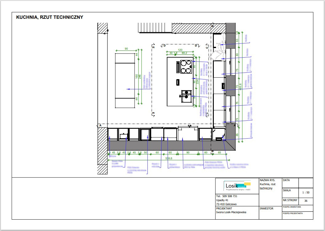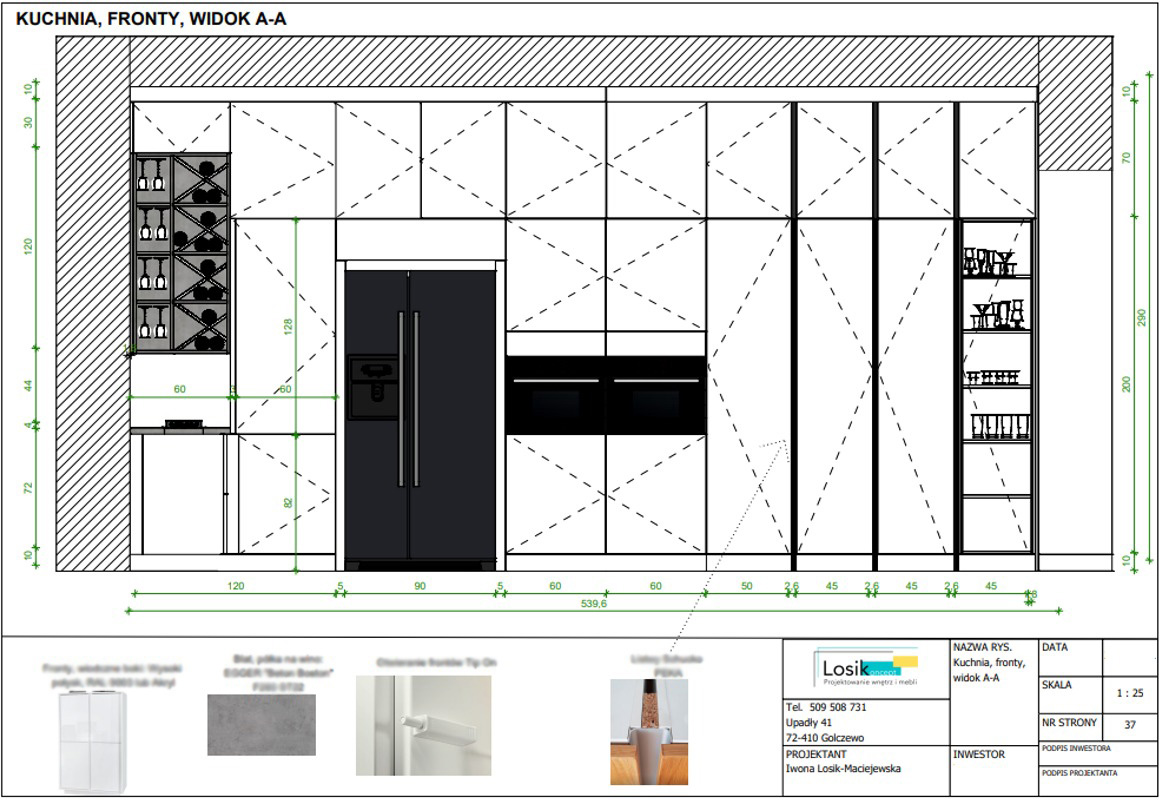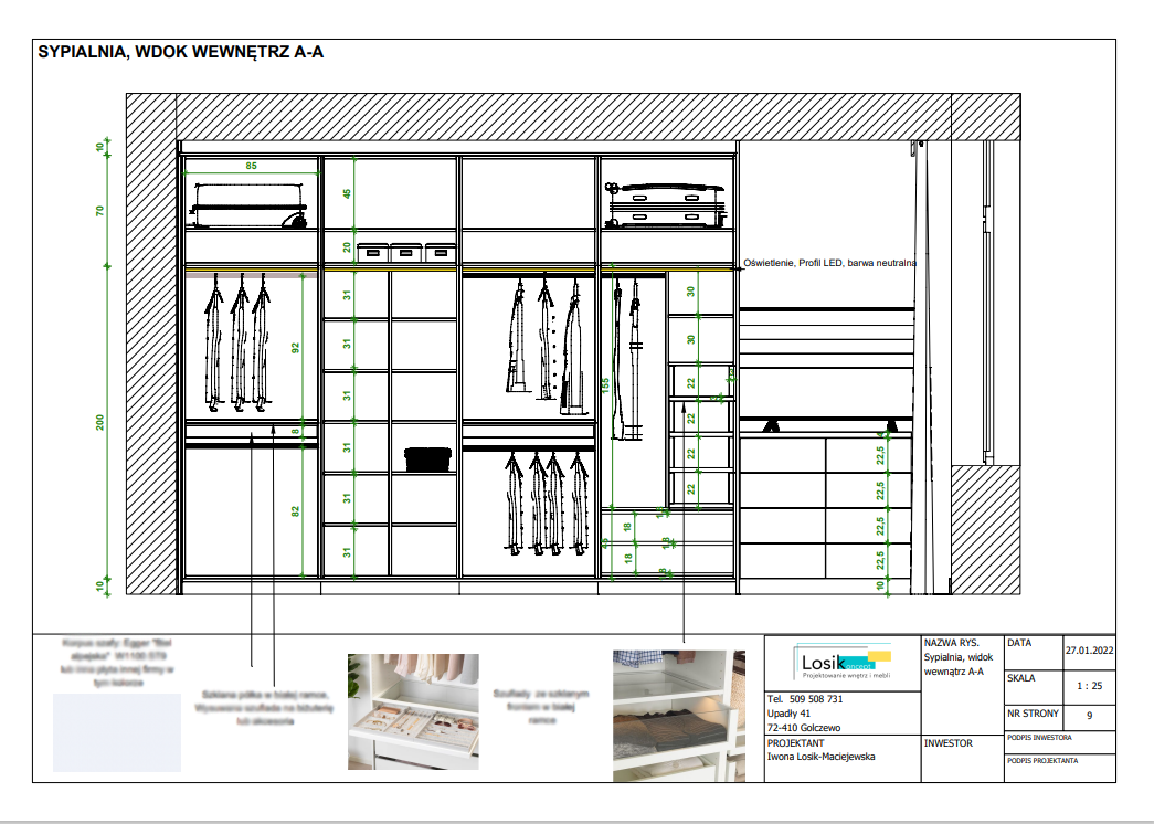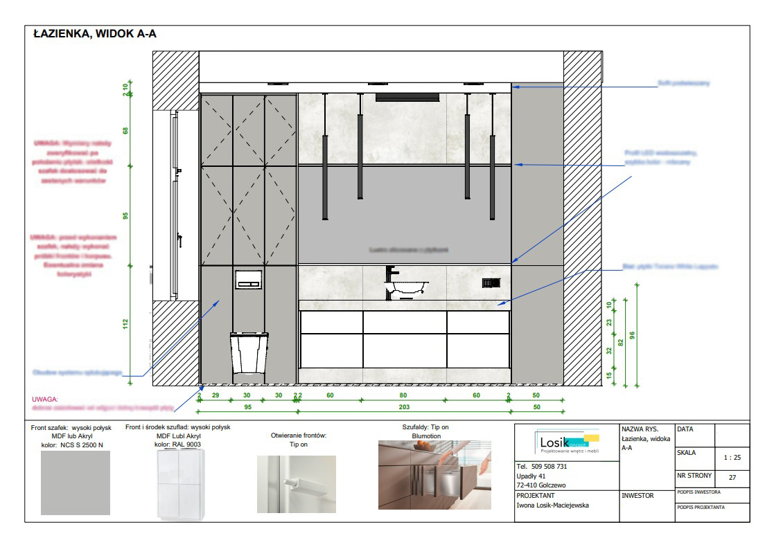 - Meble na wymiar – szczegółowe rysunki dla stolarza z wymiarami mebli, wybraną kolorystyką oraz dodatkowym wyposażeniem szafek.