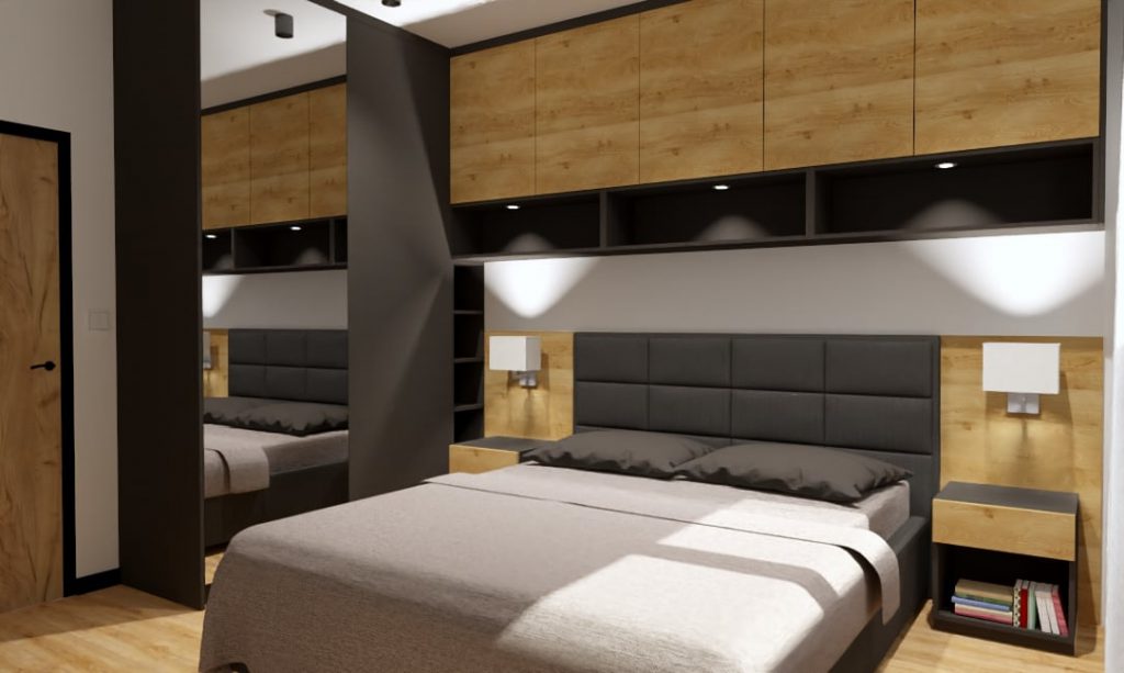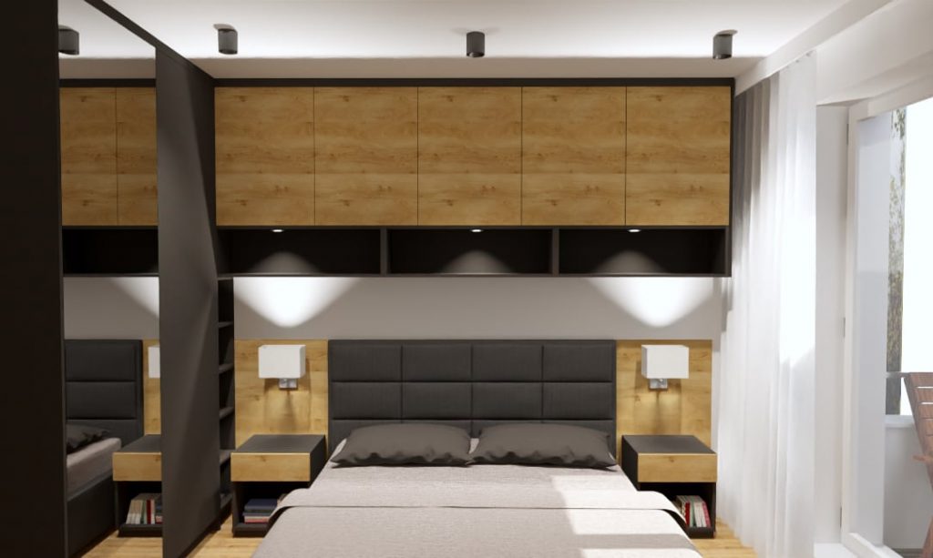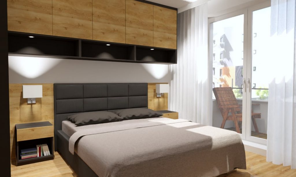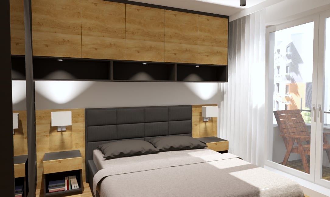 Mała sypialnia w bloku, stanowiła dla mnie nie lada wyzwanie. Okazało się jednak, że każde wnętrze można pięknie i pomysłowo urządzić. Sypialnia łączy piękno z wygodą, ponieważ przewidziałam w projekcie dużo miejsca do przechowywania.