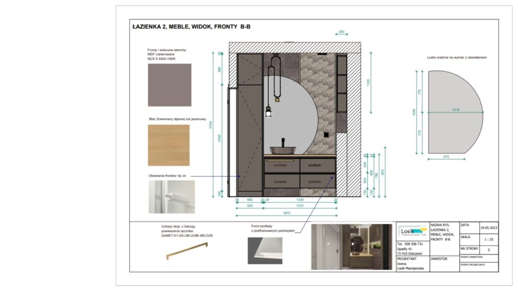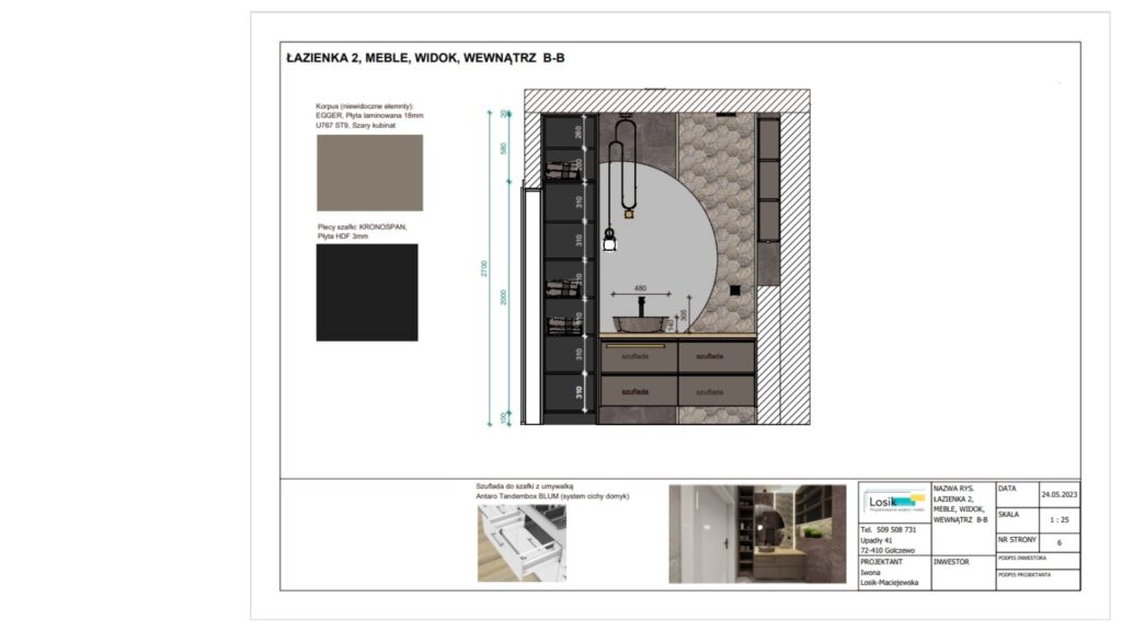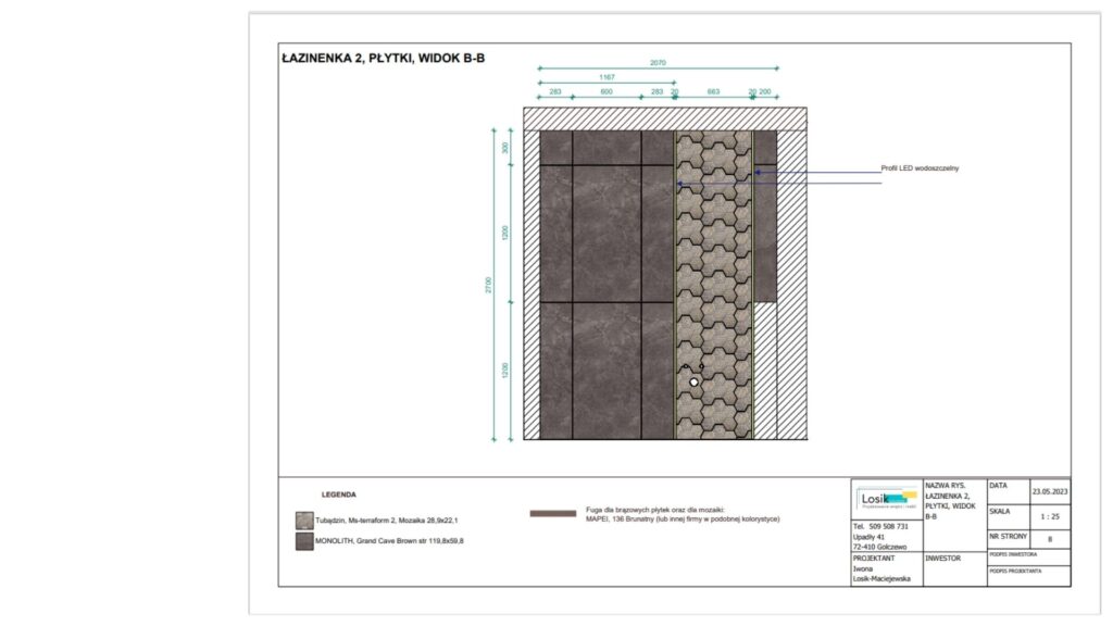 A wisienką na torcie każdego mojego projektu są oczywiście rysunki techniczne dla wykonawcy z ułożeniem płytek i mebli – bo jakże bez tego zrealizować projekt.