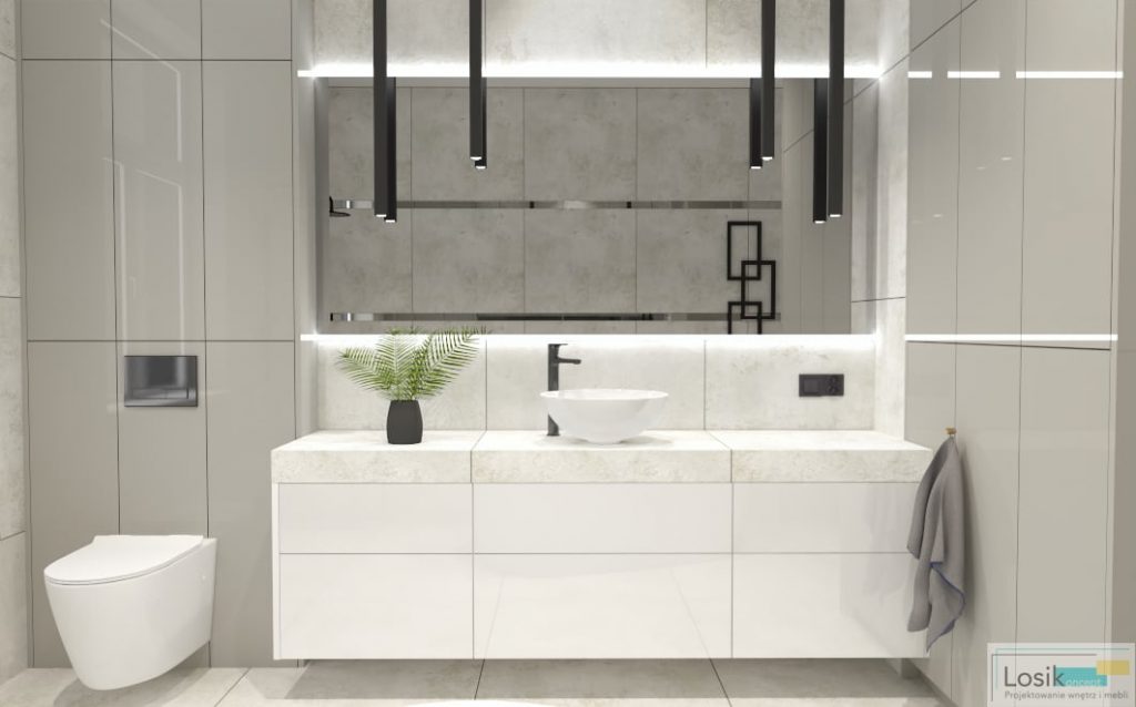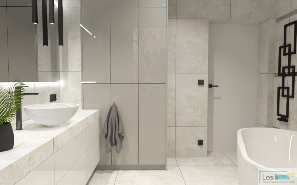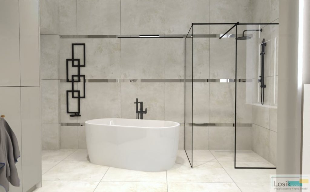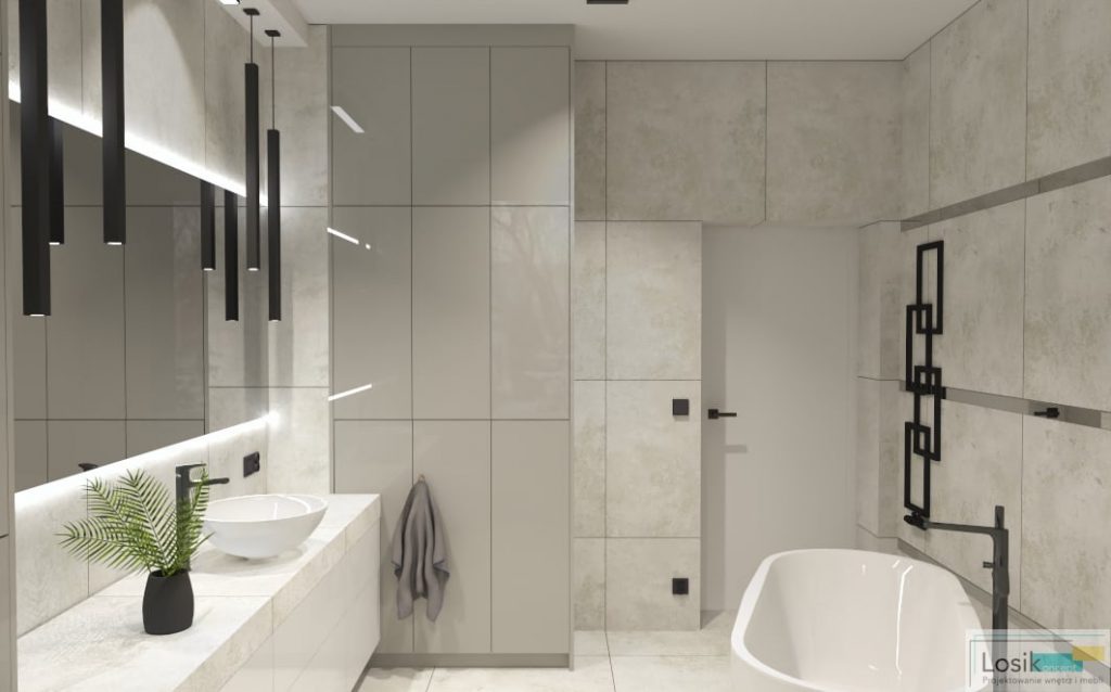 Aranżacja wnętrza łazienki była dogłębnie analizowana z potrzebami inwestorów. Zaprojektowałam wnętrze w odcieniach szarości i bieli, które w subtelny sposób połączyłam z czernią. Inwestorzy skupiają dużą uwagę na oświetleniu we wnętrzu oraz formie lamp. Lustro podświetlone zostało lampkami LED, o zimnym odcieniu. Ciekawym dodatkiem są wiszące lampy w formie sopli. Postawiliśmy również na czarny kaloryfer o nietuzinkowym kształcie. Dzięki pokaźnemu metrażowi pomieszczenia możliwe było umieszczenie wanny wolno stojącej oraz prysznica. Wanna idealnie wkomponowała się w przestrzeń z neutralnymi kolorami oraz minimalistyczną kabiną prysznicową. Natrysk z przeszkloną ścianką nadaje nowoczesnego wyglądu oraz prostotę wykonania. To wnętrze pełne światła oraz lekkiej przestrzeni.