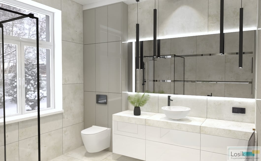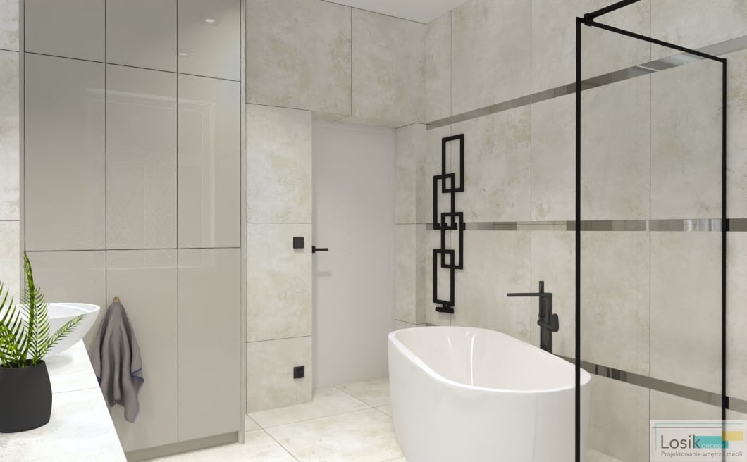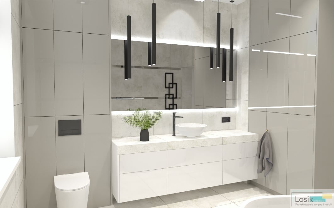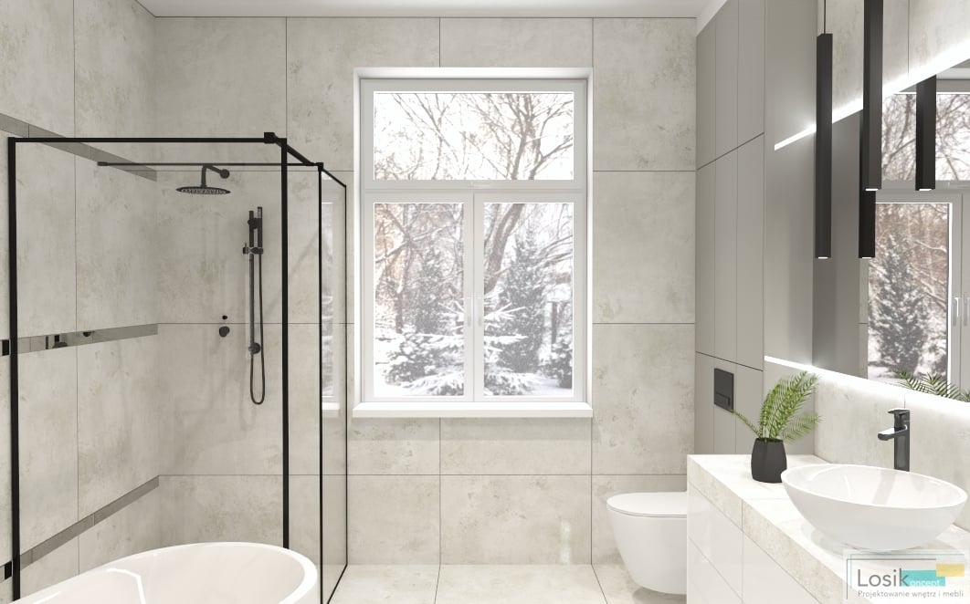 Aranżacja wnętrza łazienki była dogłębnie analizowana z potrzebami inwestorów. Zaprojektowałam wnętrze w odcieniach szarości i bieli, które w subtelny sposób połączyłam z czernią. Inwestorzy skupiają dużą uwagę na oświetleniu we wnętrzu oraz formie lamp. Lustro podświetlone zostało lampkami LED, o zimnym odcieniu. Ciekawym dodatkiem są wiszące lampy w formie sopli. Postawiliśmy również na czarny kaloryfer o nietuzinkowym kształcie. Dzięki pokaźnemu metrażowi pomieszczenia możliwe było umieszczenie wanny wolno stojącej oraz prysznica. Wanna idealnie wkomponowała się w przestrzeń z neutralnymi kolorami oraz minimalistyczną kabiną prysznicową. Natrysk z przeszkloną ścianką nadaje nowoczesnego wyglądu oraz prostotę wykonania. To wnętrze pełne światła oraz lekkiej przestrzeni.
