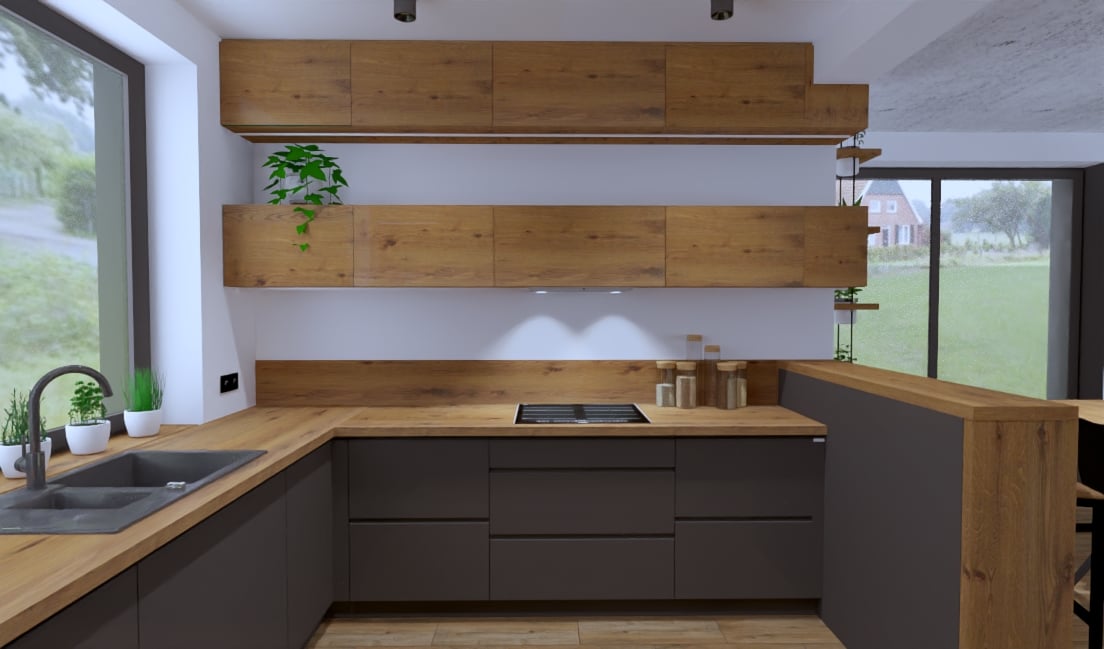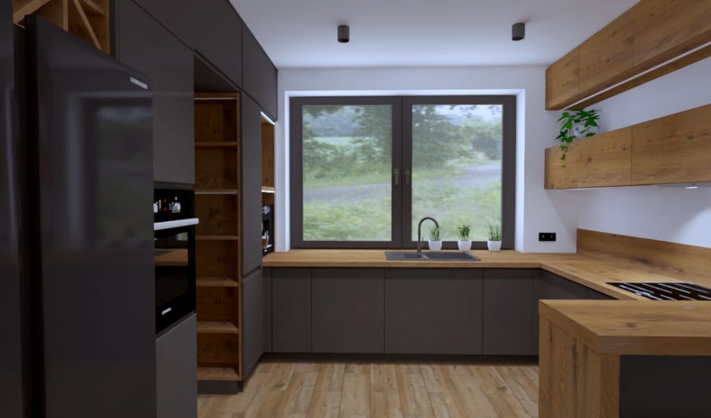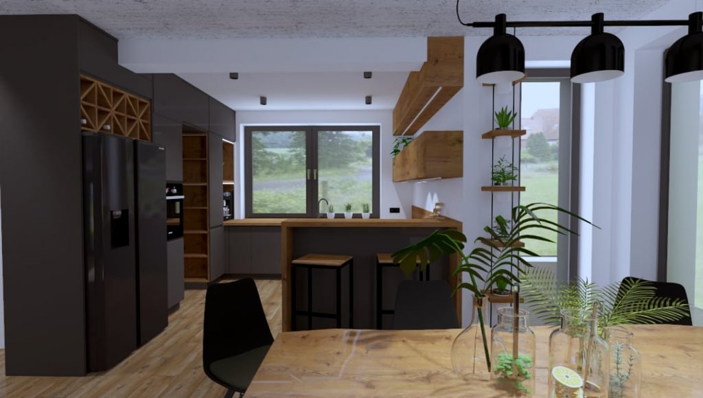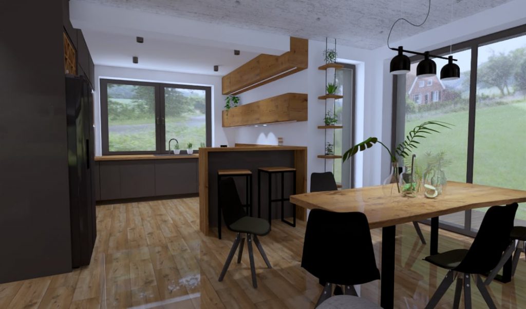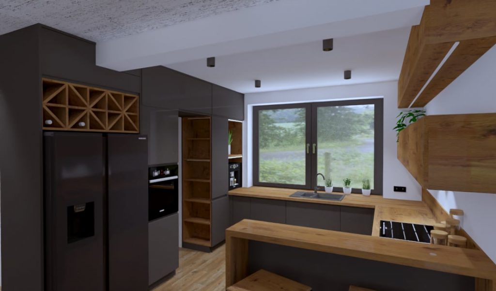 Klimatyczna kuchnia w domku jednorodzinnym. Ciemne barwy łączą się z drewnianymi frontami mebli oraz blatów. Kuchnia w swej istocie jest bardzo funkcjonalna, duża ilość regałów oraz szafek pozwala stworzyć uporządkowaną przestrzeń. Ciekawym elementem, jest miejsce do przechowywania butelek, które dzięki temu, że nie posiada frontów, są dobrze widoczne i łatwo dostępne. Akcent w postaci roślin ożywia i odświeża wnętrze. W przeszklonej, słonecznej jadalni króluje drewniany stół z czarnymi krzesłami. Dodatkowo pomiędzy jadalnią a kuchnią znalazło się miejsce na dwa hokery. Funkcjonalna przestrzeń uprzyjemnia codzienną aktywność.
