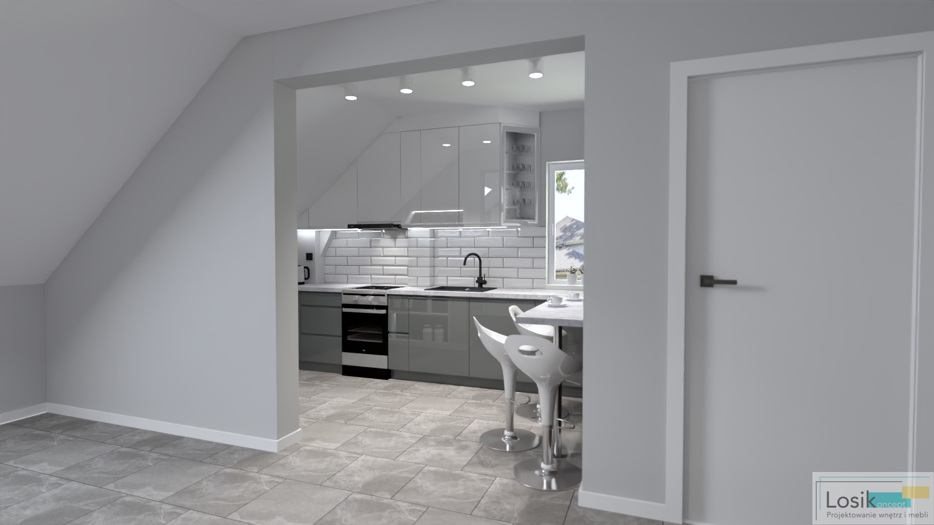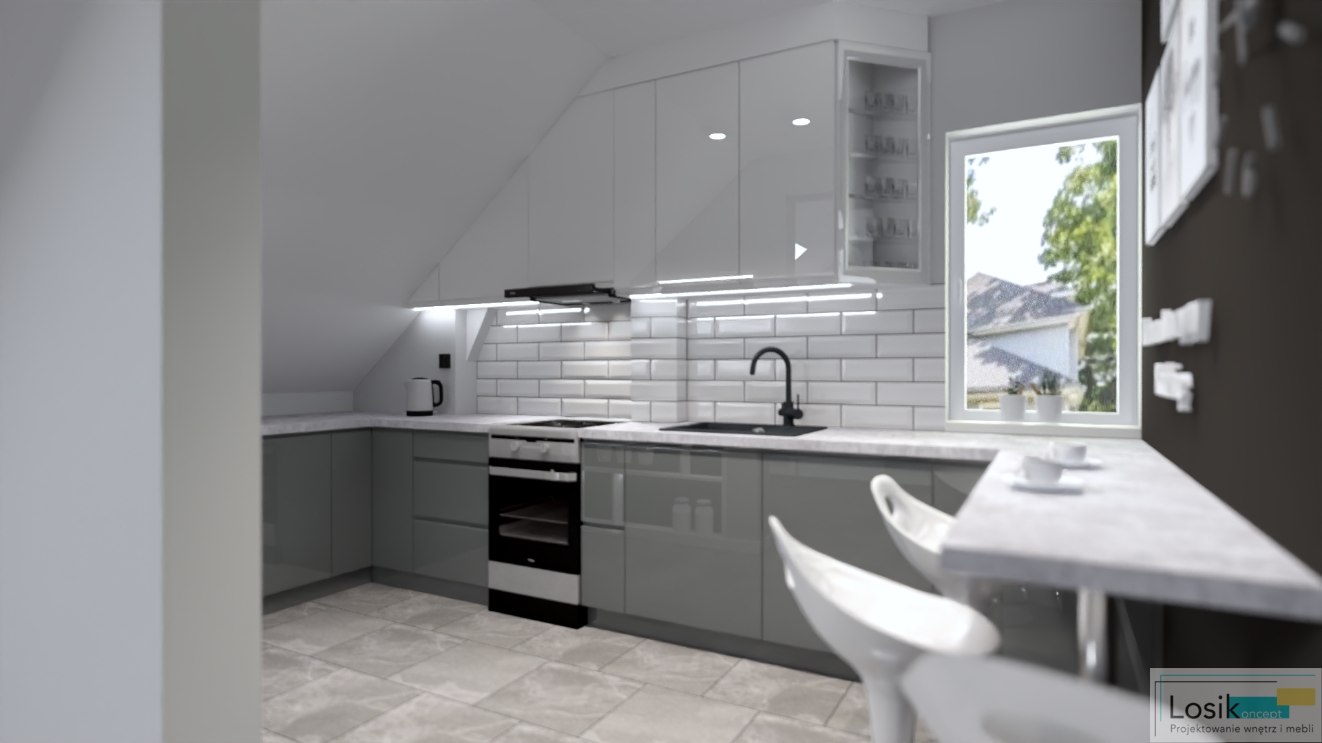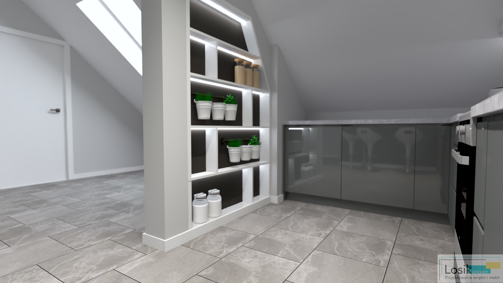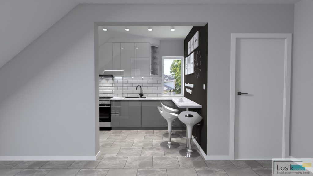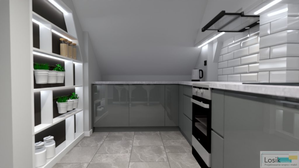 Spójność kolorystyczna, zgrane połączenie barw i minimalizm. Projekt wpisuje się w trend naturalny, którego podstawą są barwy złamanych odcieni bieli i szarości. Kuchnia na poddaszu, bardzo nietypowe skosy, wnęki. Ciekawym pomysłem na tą aranżację stały się fronty szafek kuchennych w dwóch różnych, ale pasujących do siebie kolorach. Inwestorzy wymarzyli sobie również wydzielenie strefy na spożywanie posiłków oraz poranną kawę. W pomieszczeniu umieściłam również podświetlany regał, który pełni funkcję nie tylko dekoracyjną, ale również funkcjonalną do przechowywania. Aranżacja jest spójna, a jednocześnie nietypowa i niepowtarzalna, dzięki delikatnym, ale wyróżniającym się akcentom kolorystycznym.