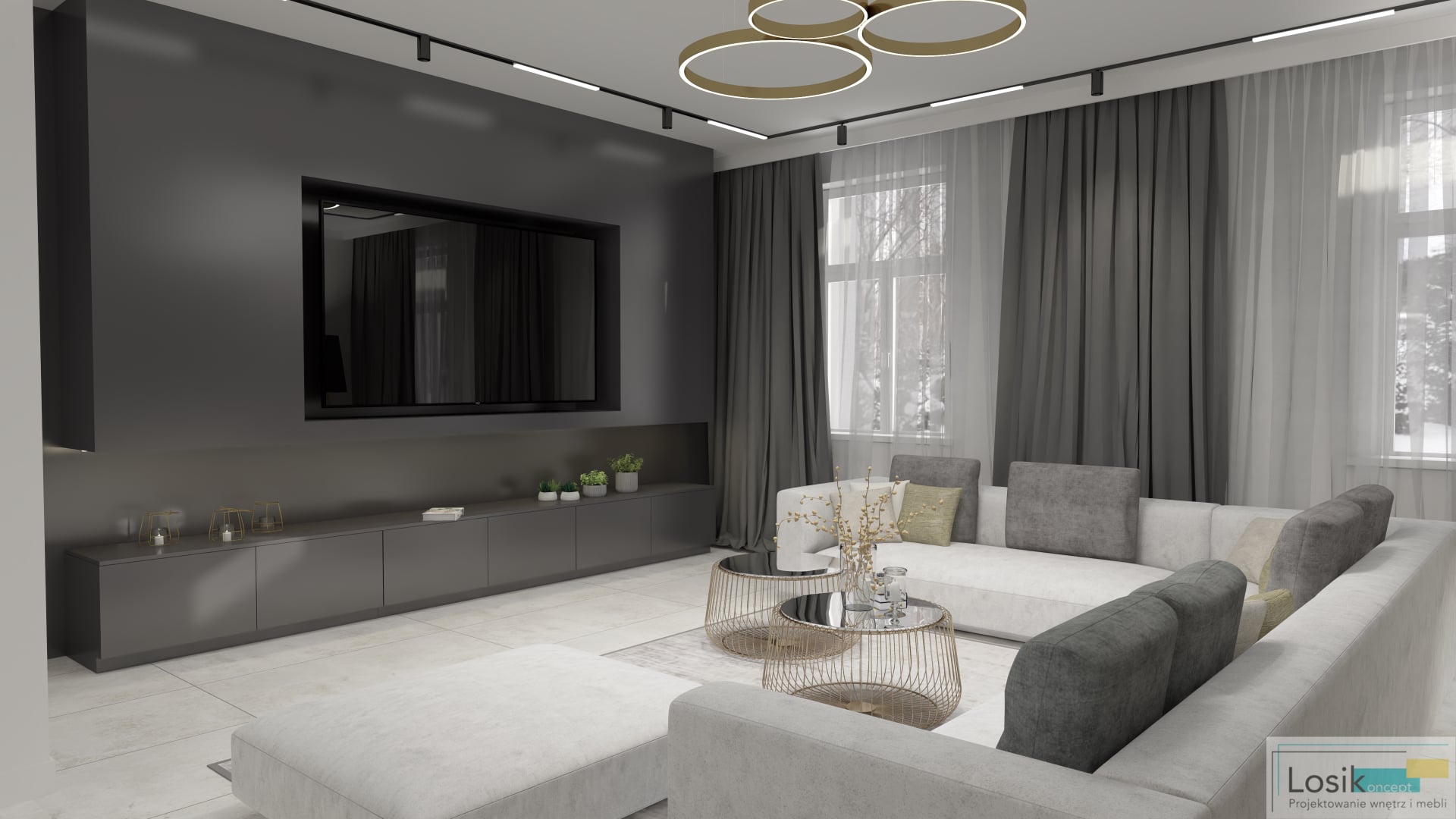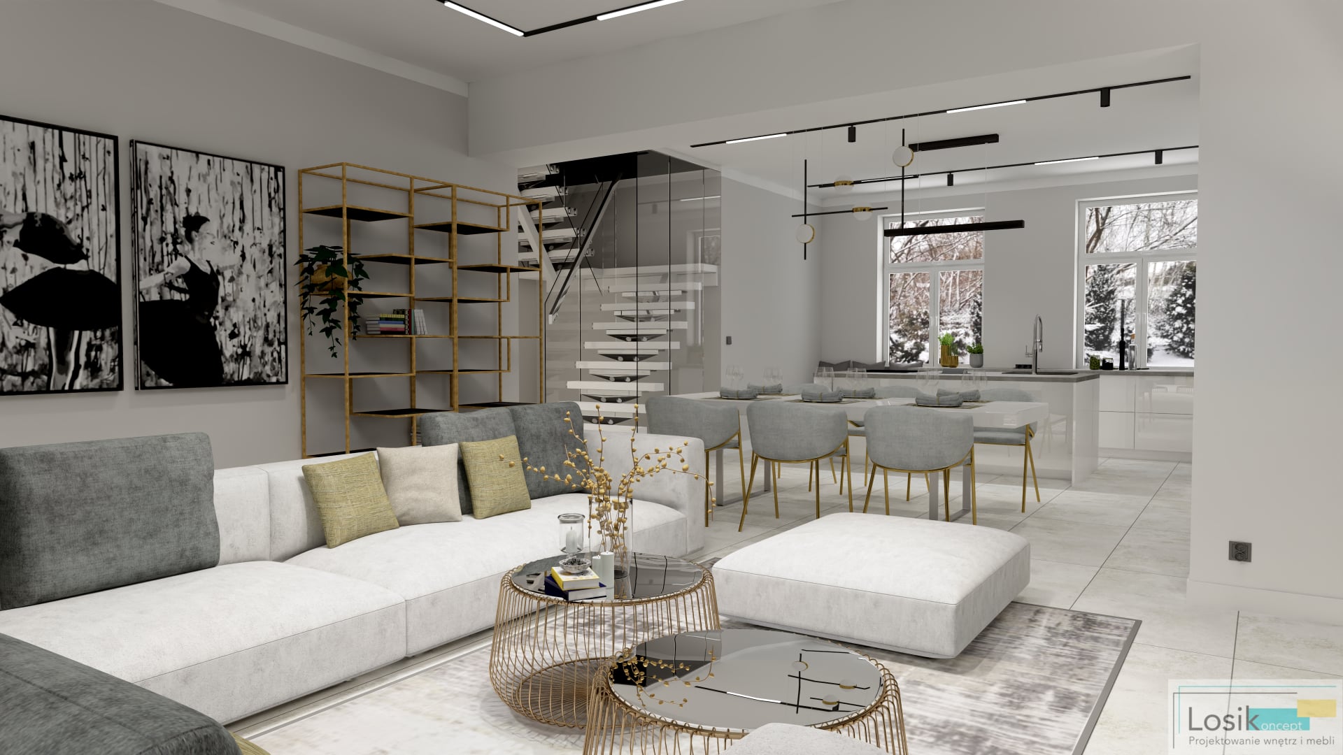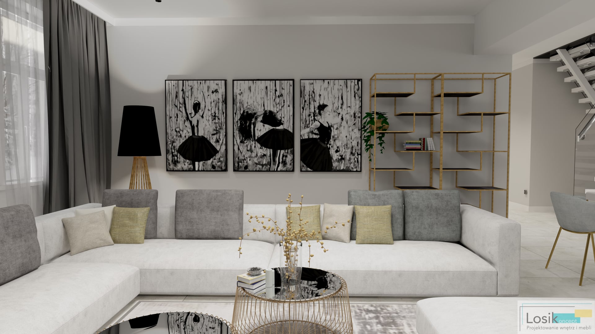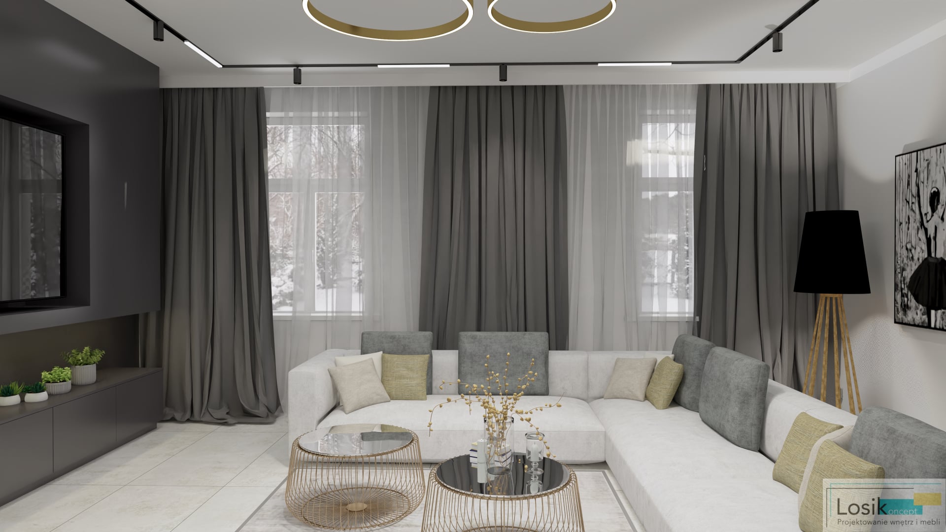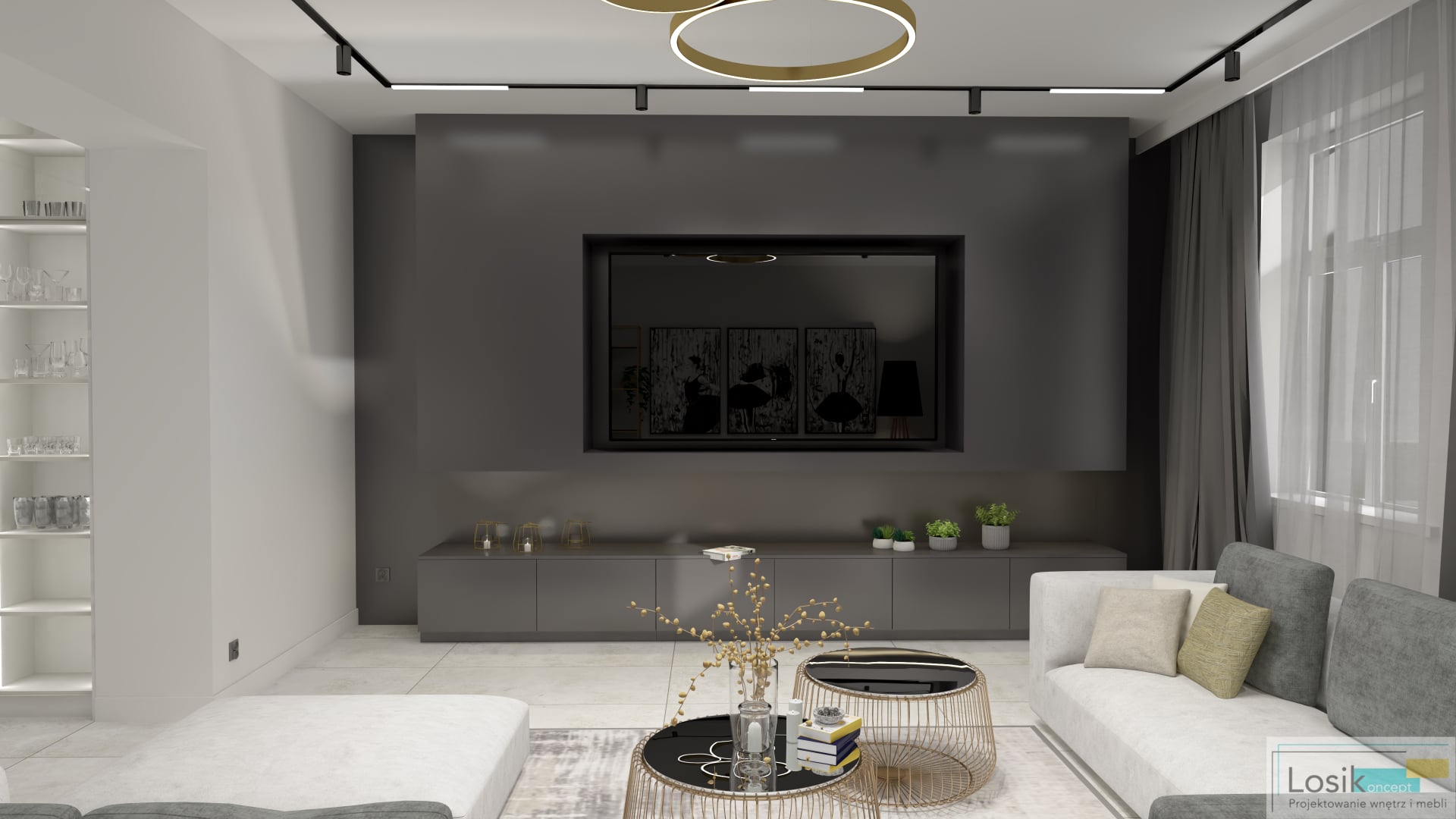 Funkcjonalne i ponadczasowe wnętrze w nowoczesnym wydaniu. Panuje tu minimalizm, który umożliwia relaks i odpoczynek w zaciszu domu. Elementy materiałowe i kolorystyczne tworzą niebywały charakter przestrzeni. Zastosowanie barw bieli oraz szarości przełamanych złotymi oraz czarnymi akcentami w postaci nietypowych lamp, regałów, oraz stolików. Na ścianie zawisły obrazy kontrastujące z kolorami panującymi we wnętrzu. Narożnik w kolorze bieli o niebanalnej strukturze jest dużym i wygodnym meblem, odpowiednim dla całej rodziny. Jedną z ciekawych dekoracji domu jest ściana z telewizorem ukrytym we wnęce. W salonie znajduje się również zabudowa meblowa z komodami i regałami na książki