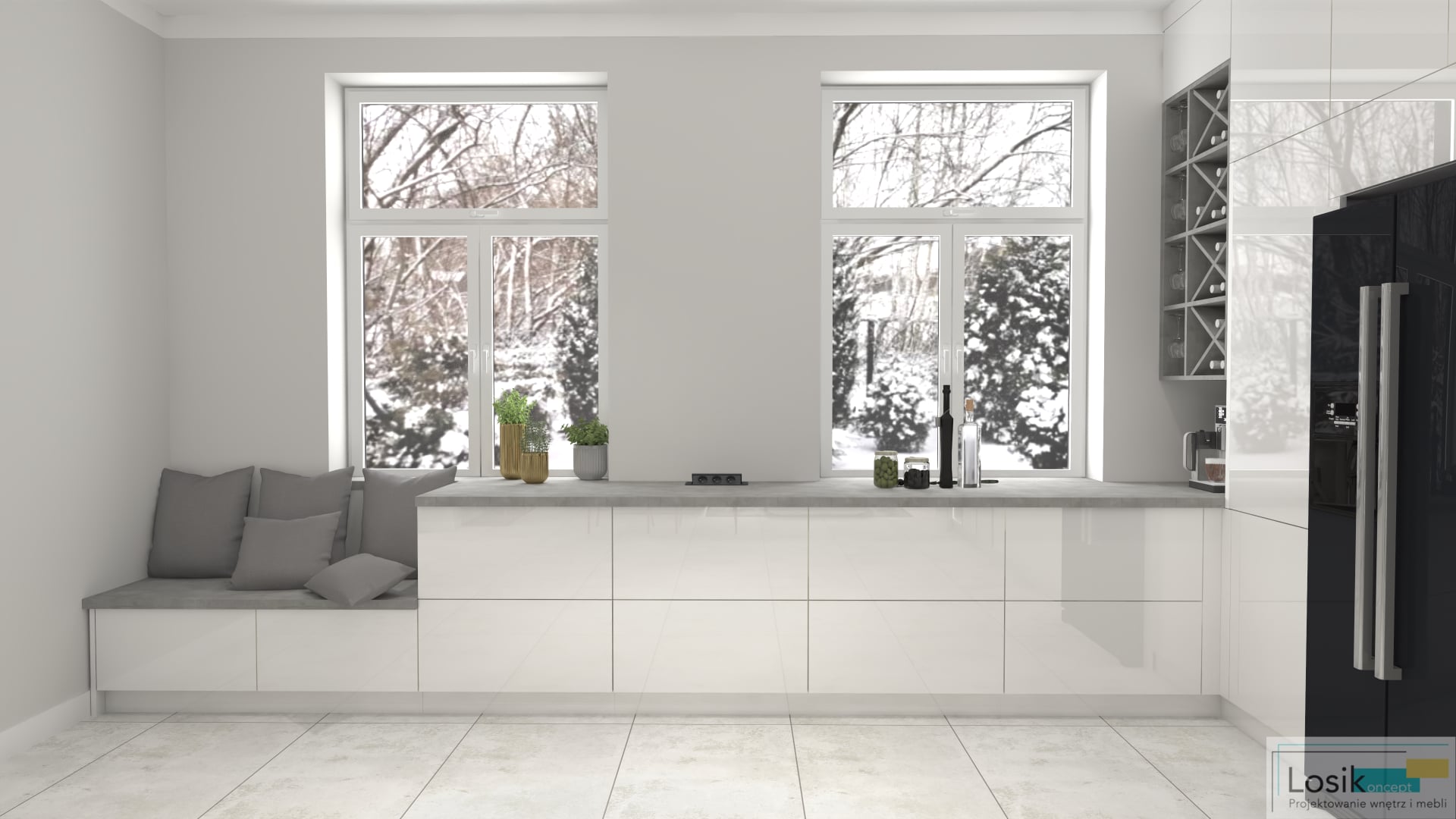 Kuchnia z frontami w kolorze bieli i kamiennymi blatami w odcieniach szarości jest wydzielona od strefy wypoczynkowej dużą wyspą kuchenną, na której umieszczony został zlew oraz płyta indukcyjna, ciekawym elementem jest również ukryty w blacie kontakt. Kuchnia posiada liczne szafki dzięki czemu przestrzeń jest uporządkowana oraz minimalistyczna. W strefie jadalnej pojawia się prostokątny, biały, rozkładany stół na wysoki połysk. Wnętrze domu zostało skomponowane tak, by kojarzącej się z klasyką kolorystyce dodać nowoczesny, niebanalny, a jednocześnie bardzo gościnny i przytulny charakter.